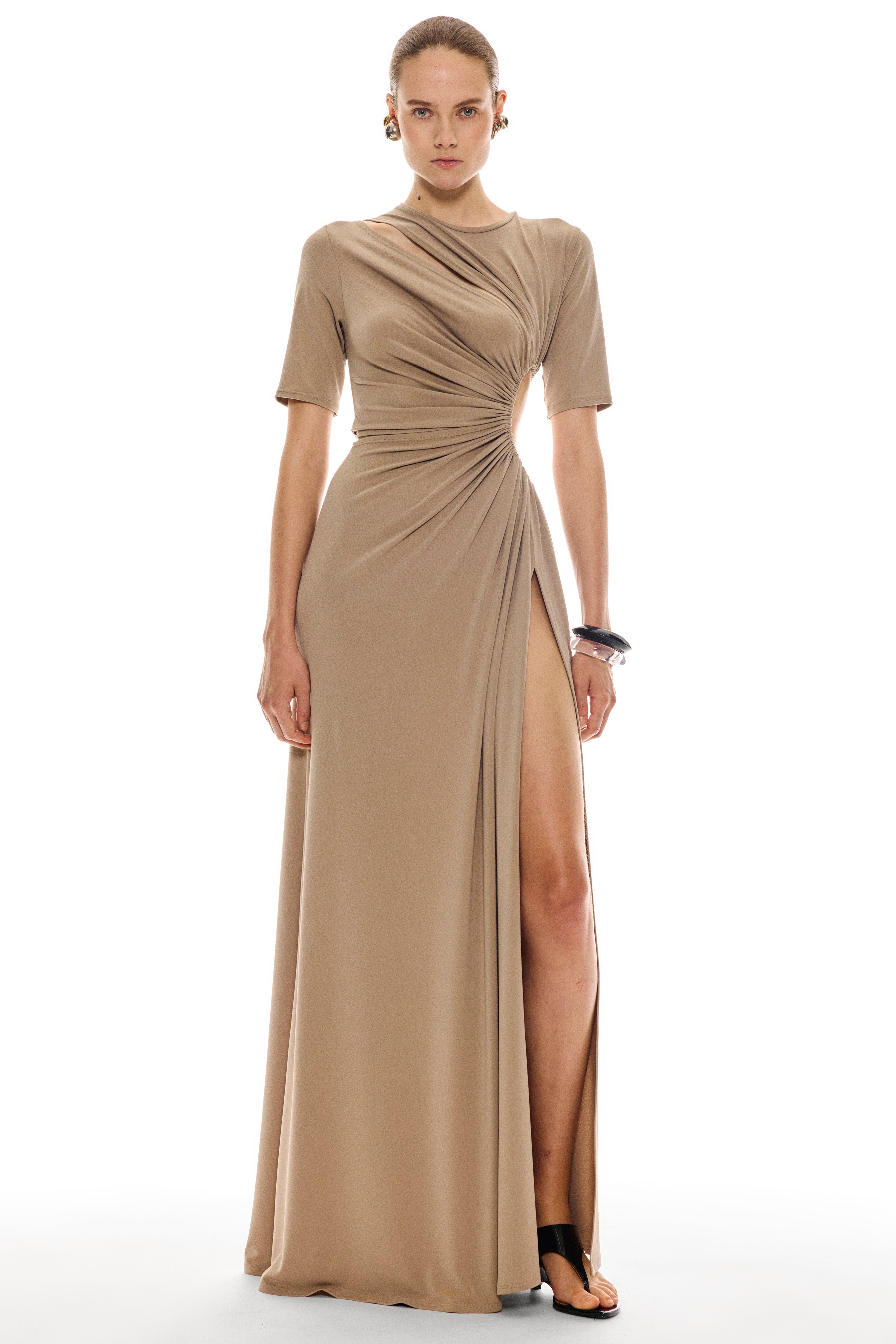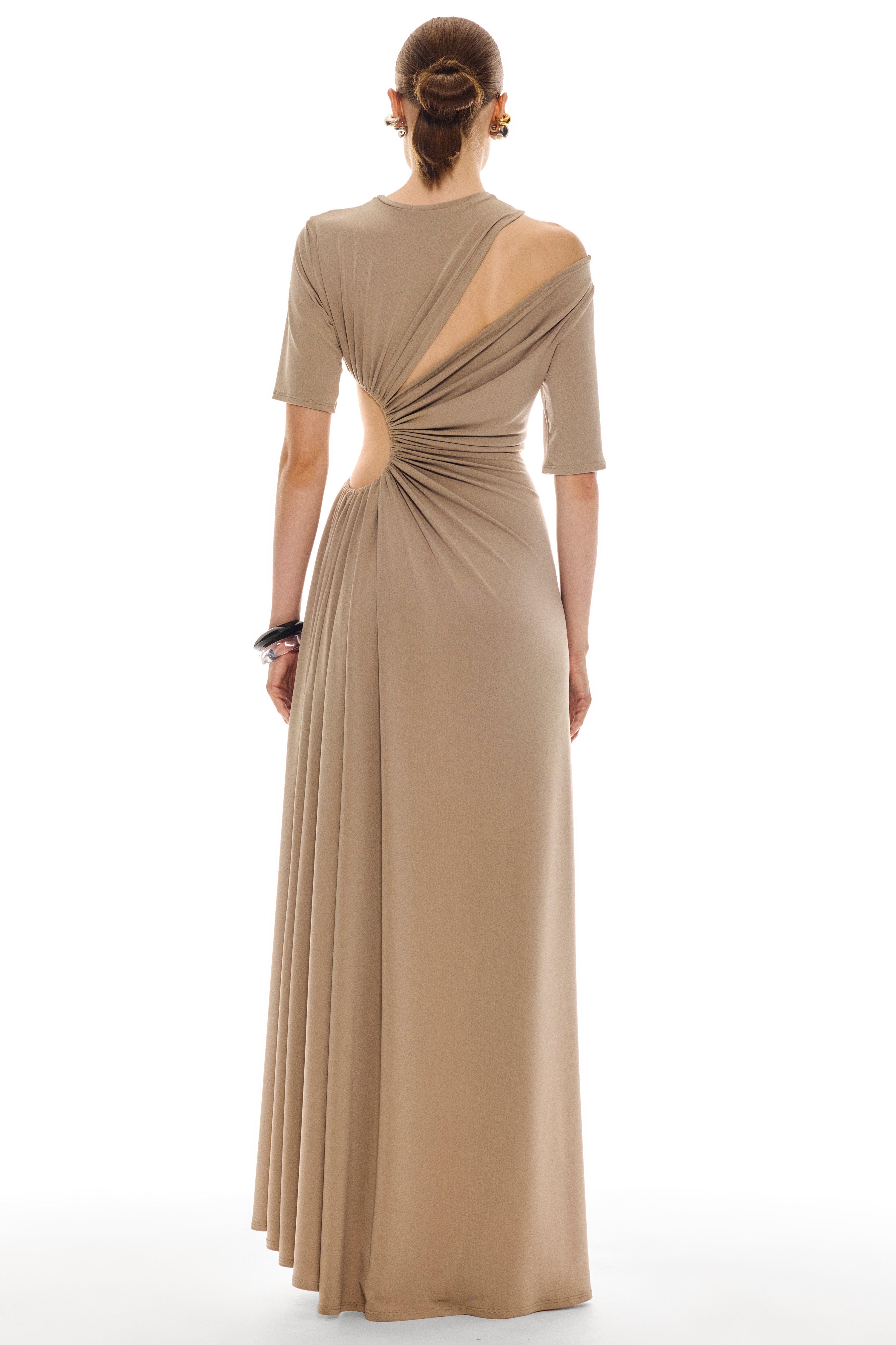 - The shoulder has a hook and eye that can undo to pull one side off-shoulder.