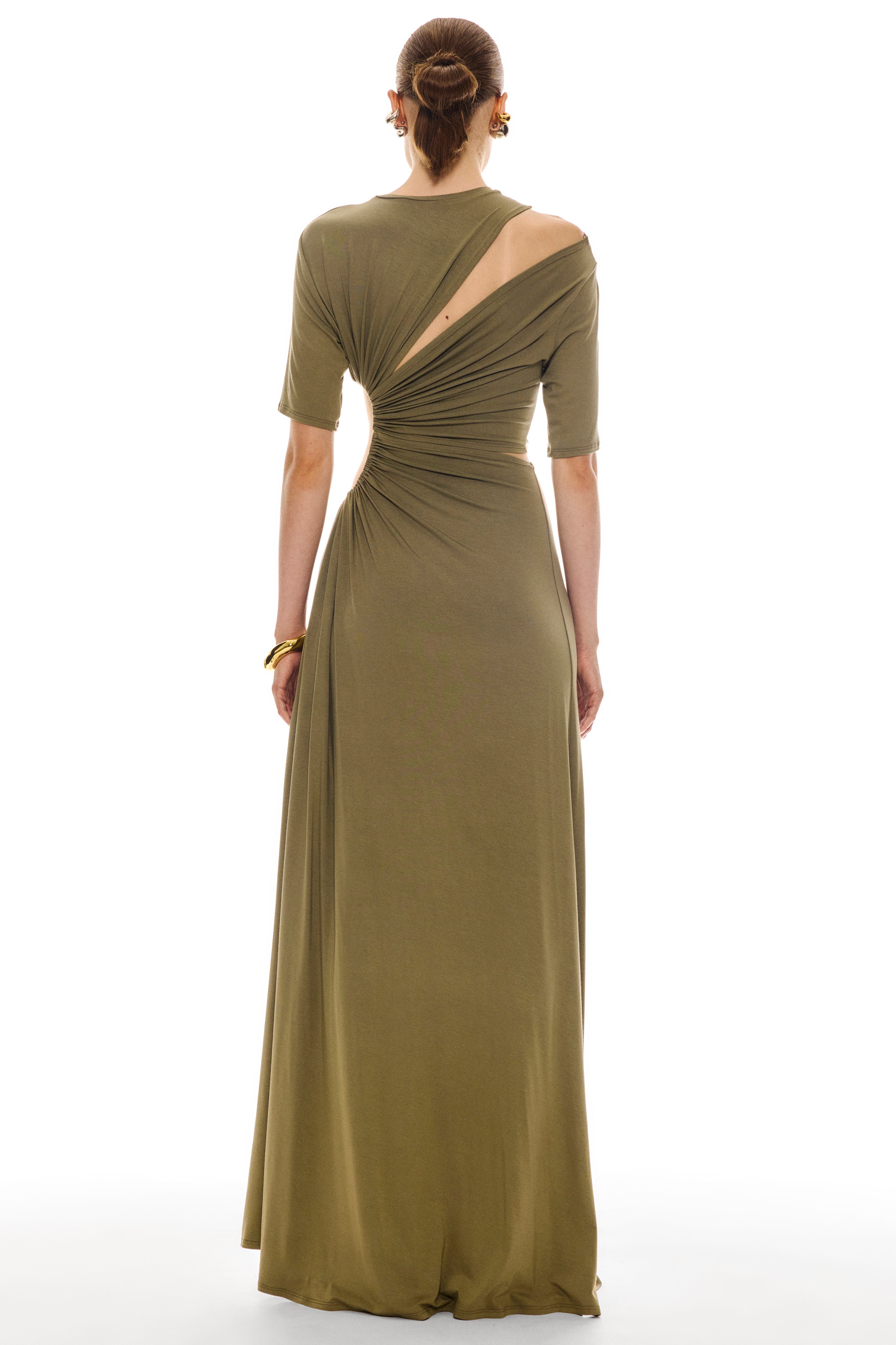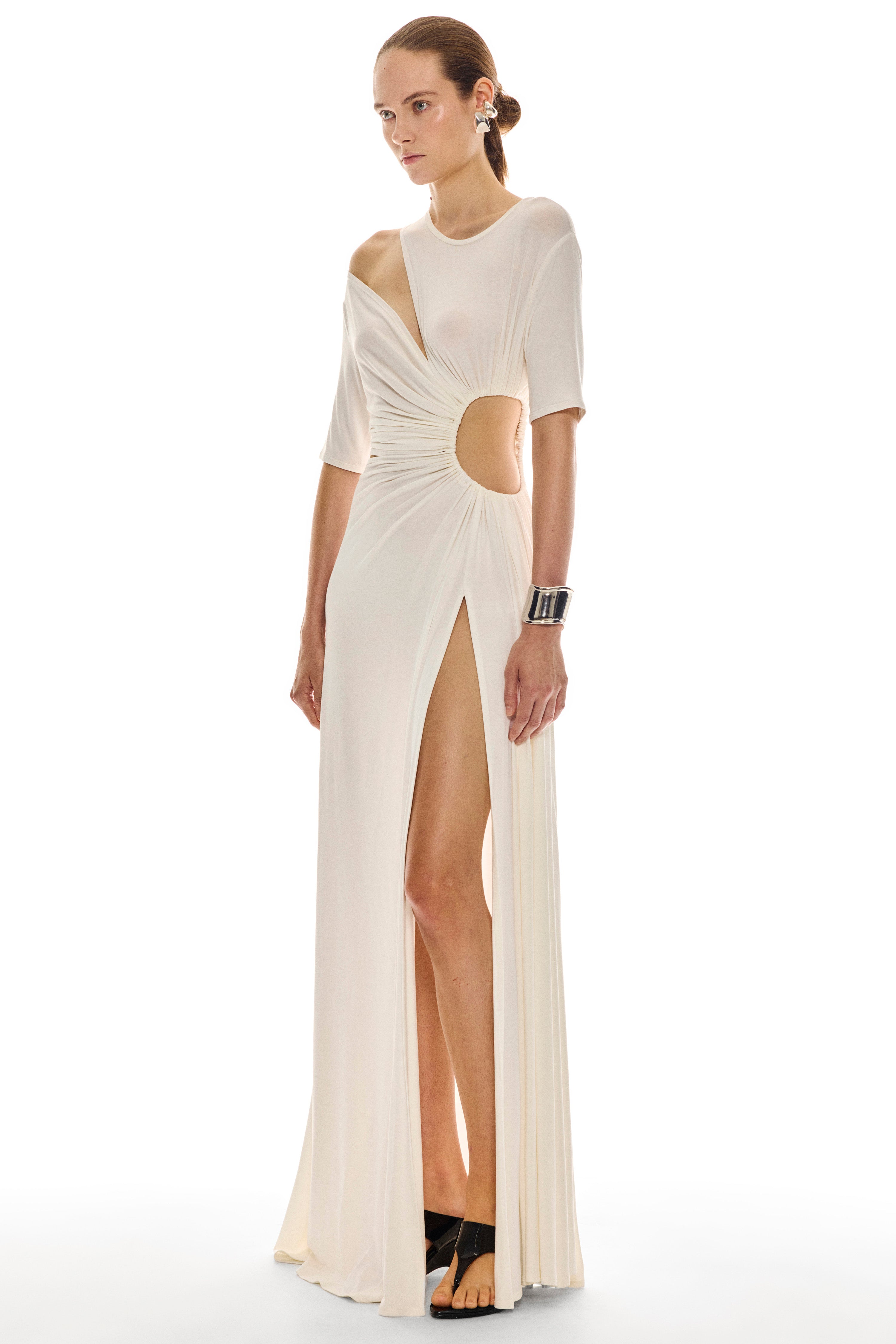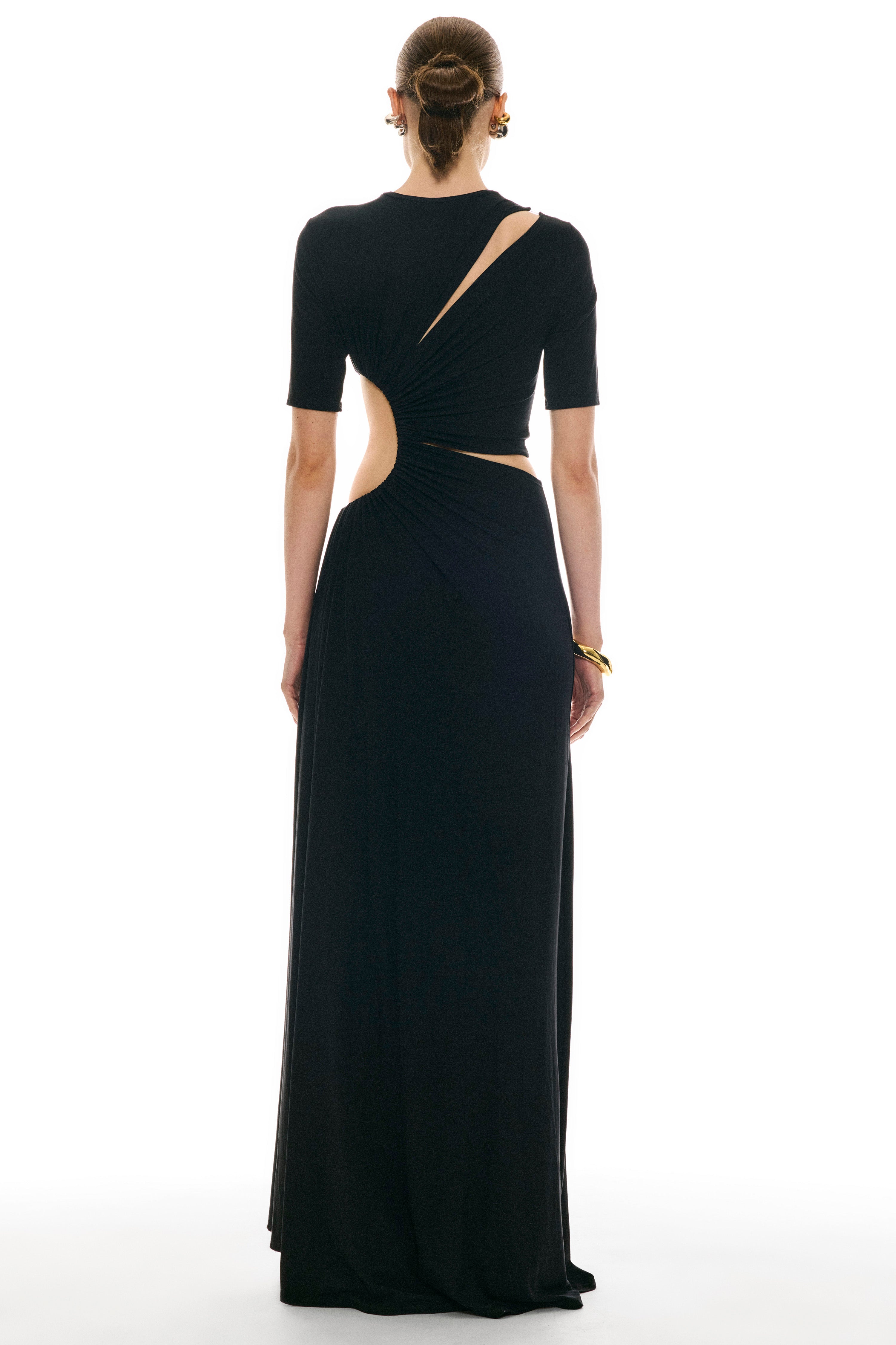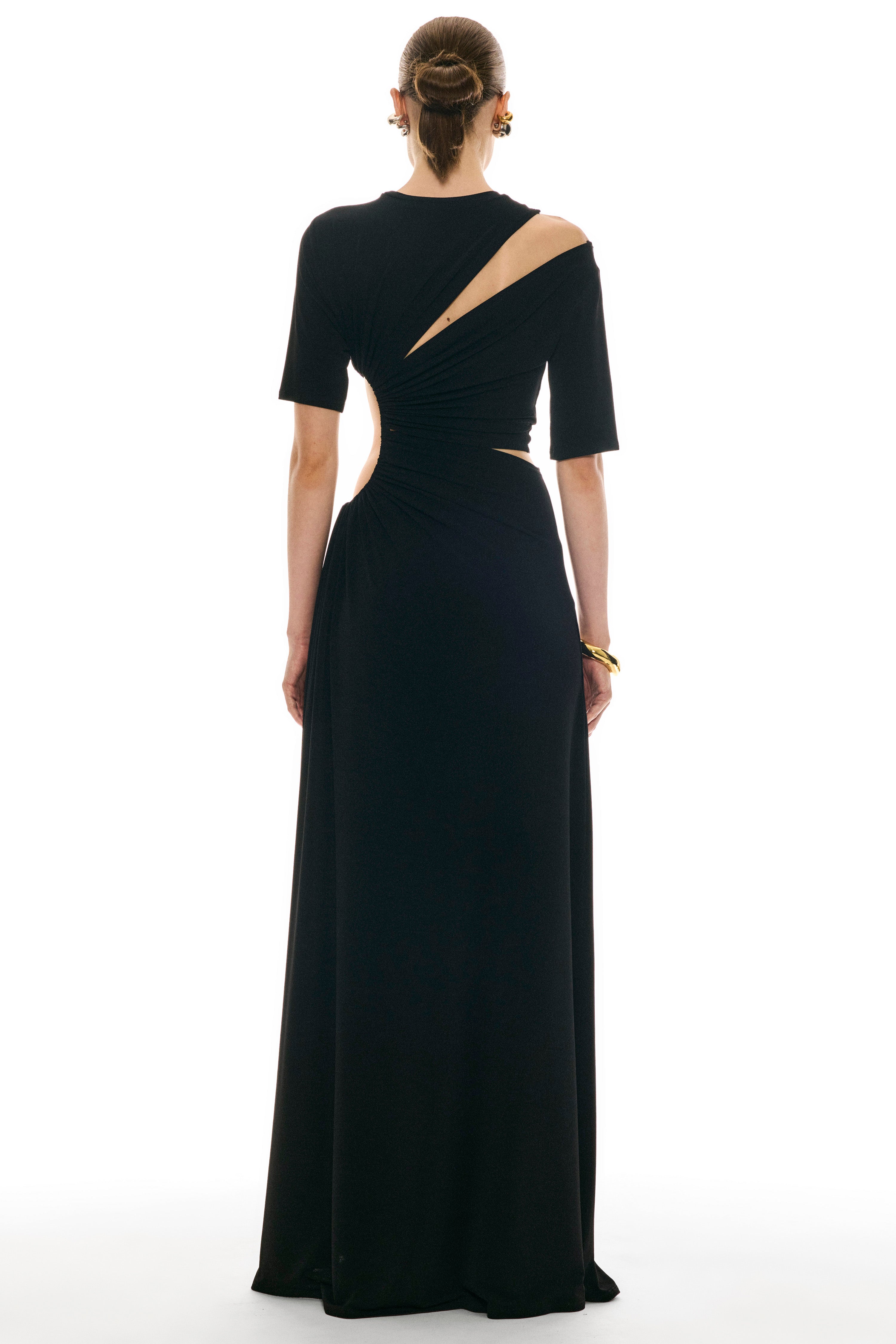 - The shoulder has a hook and eye that can undo to pull one side off-shoulder. (Shown in black)
