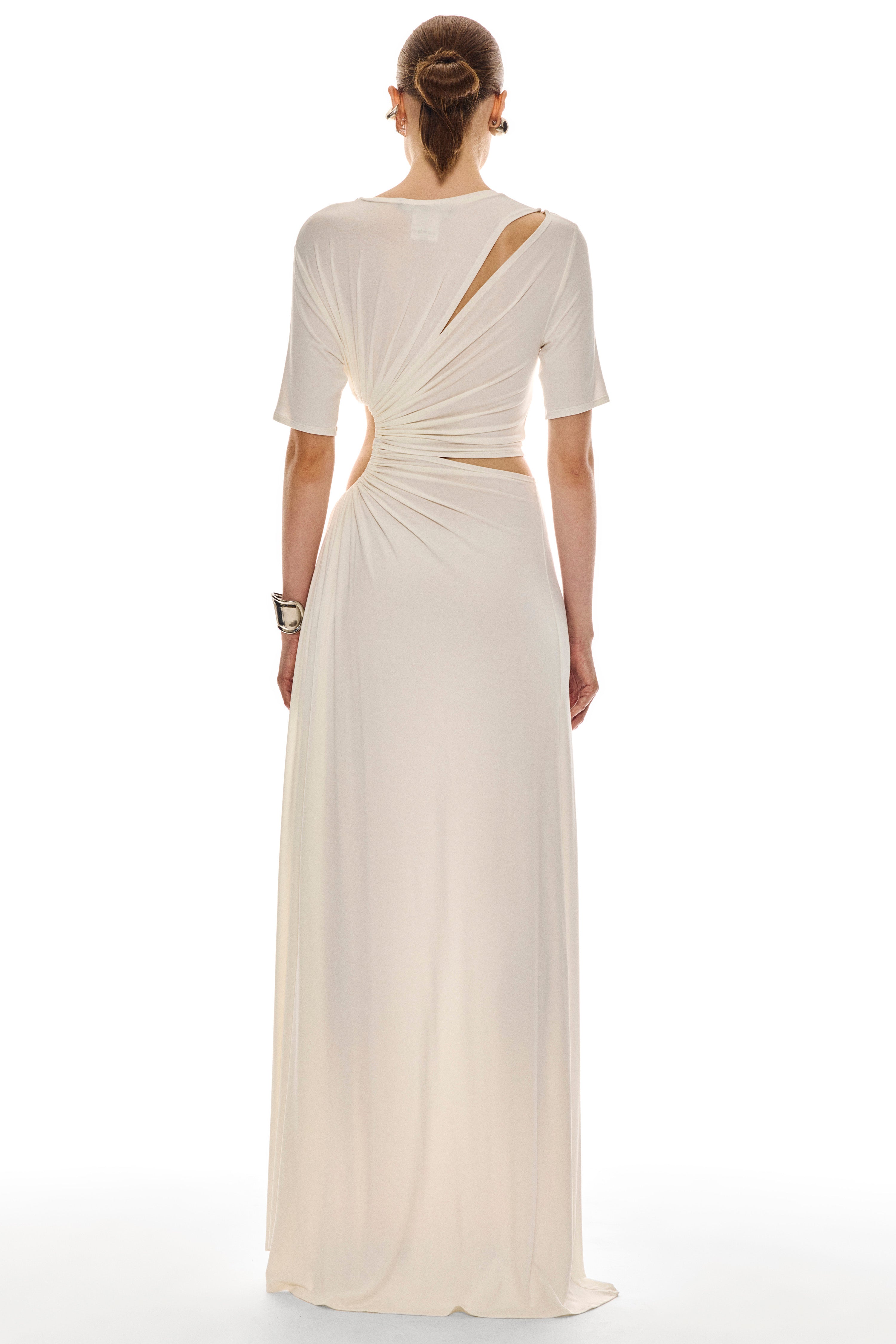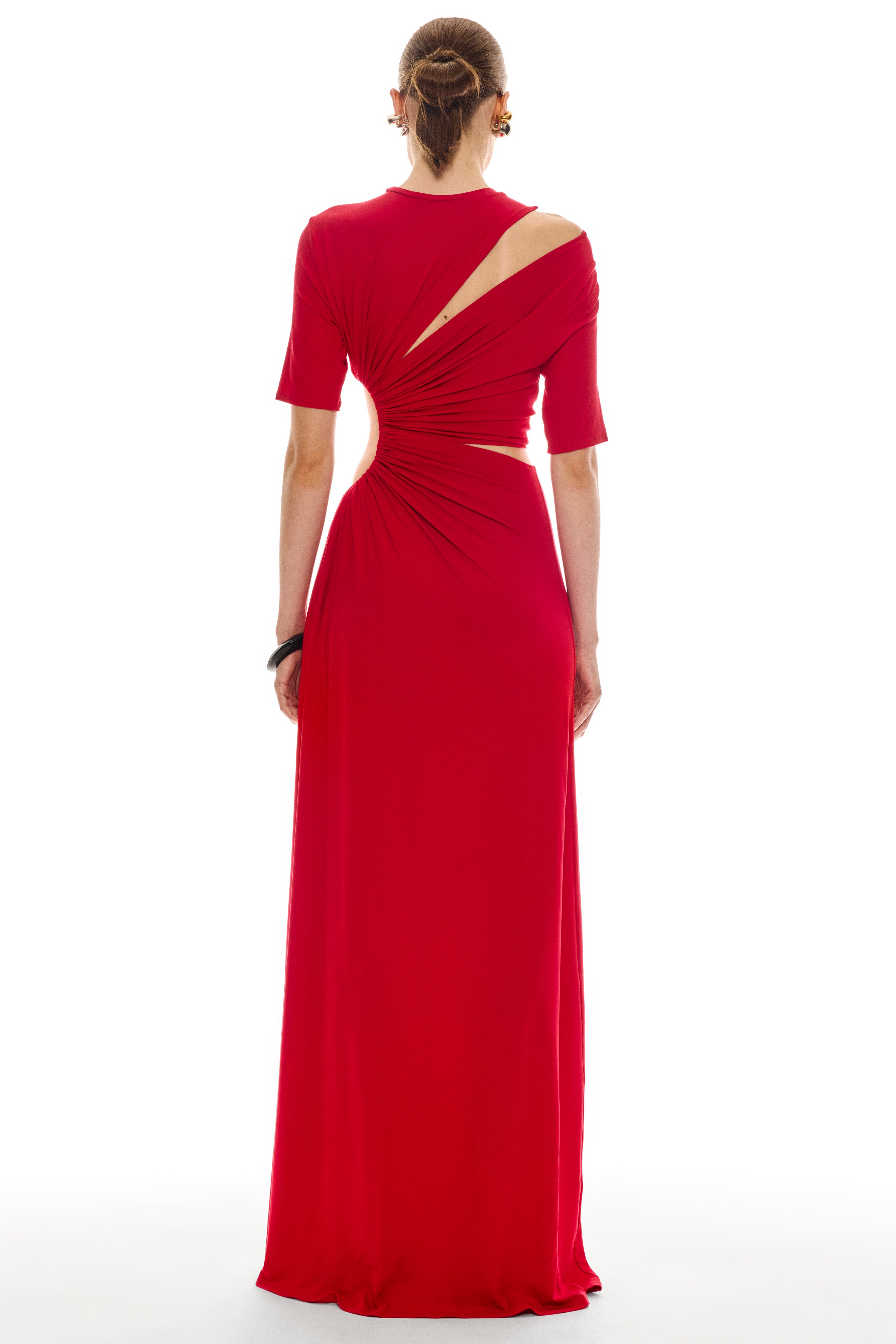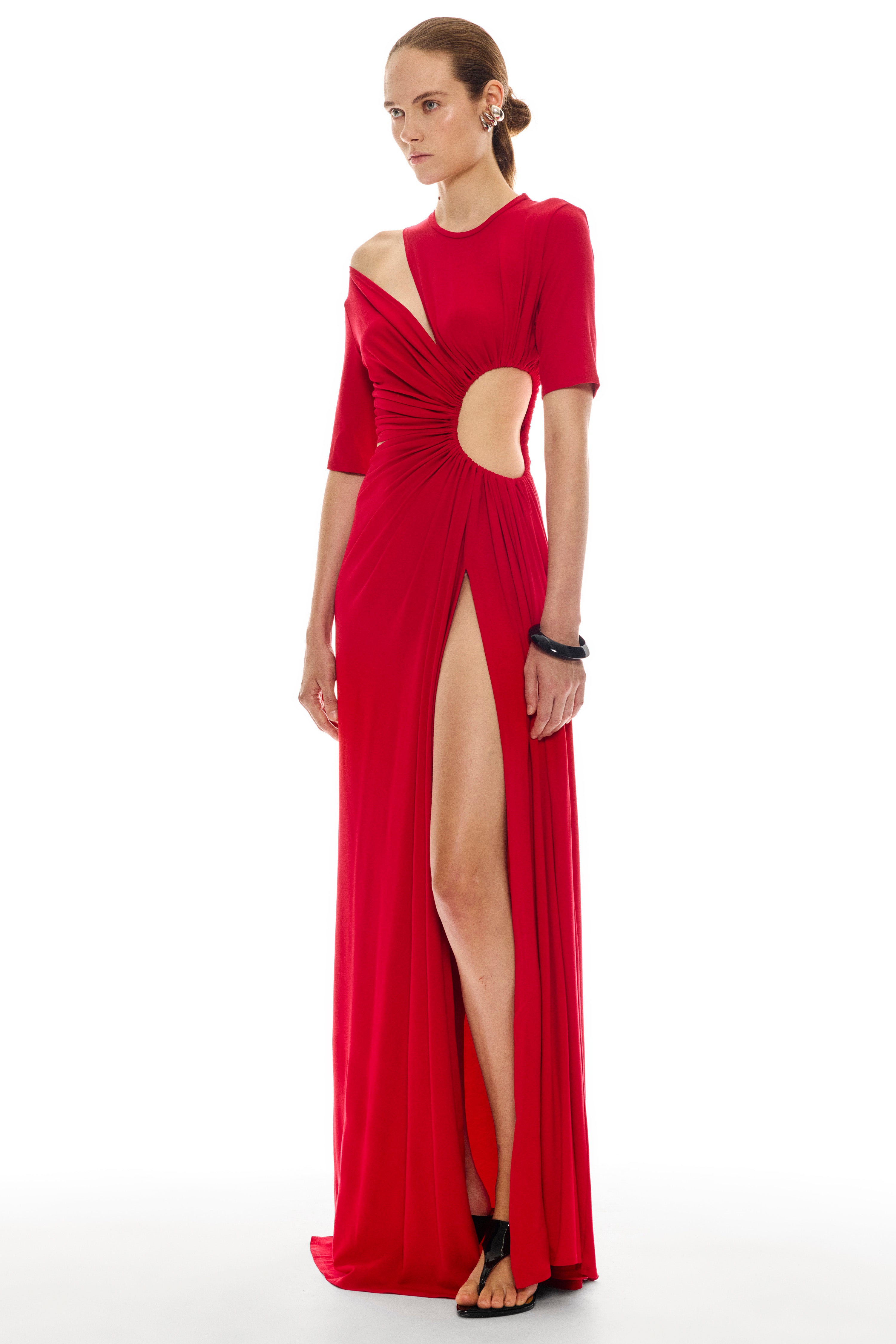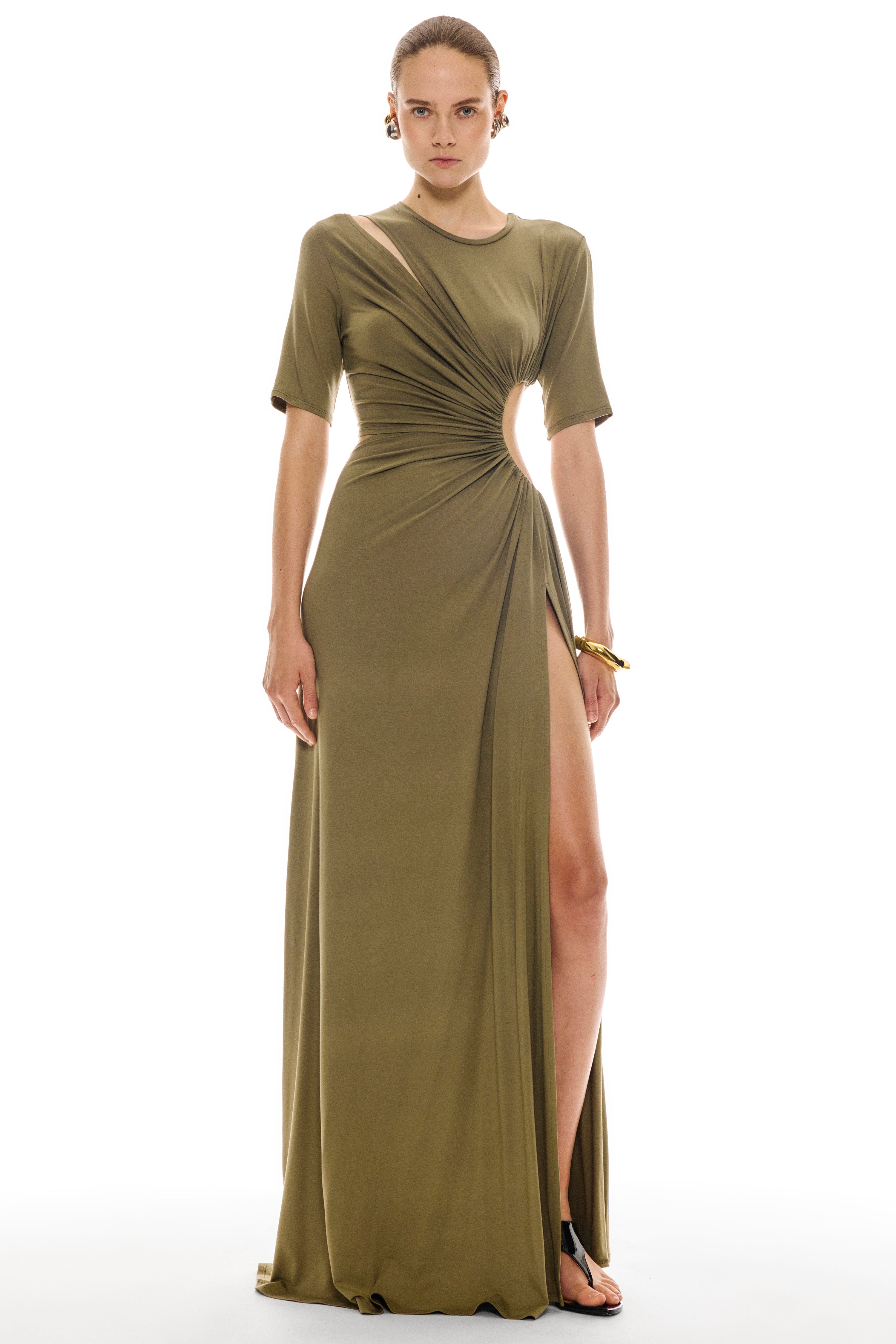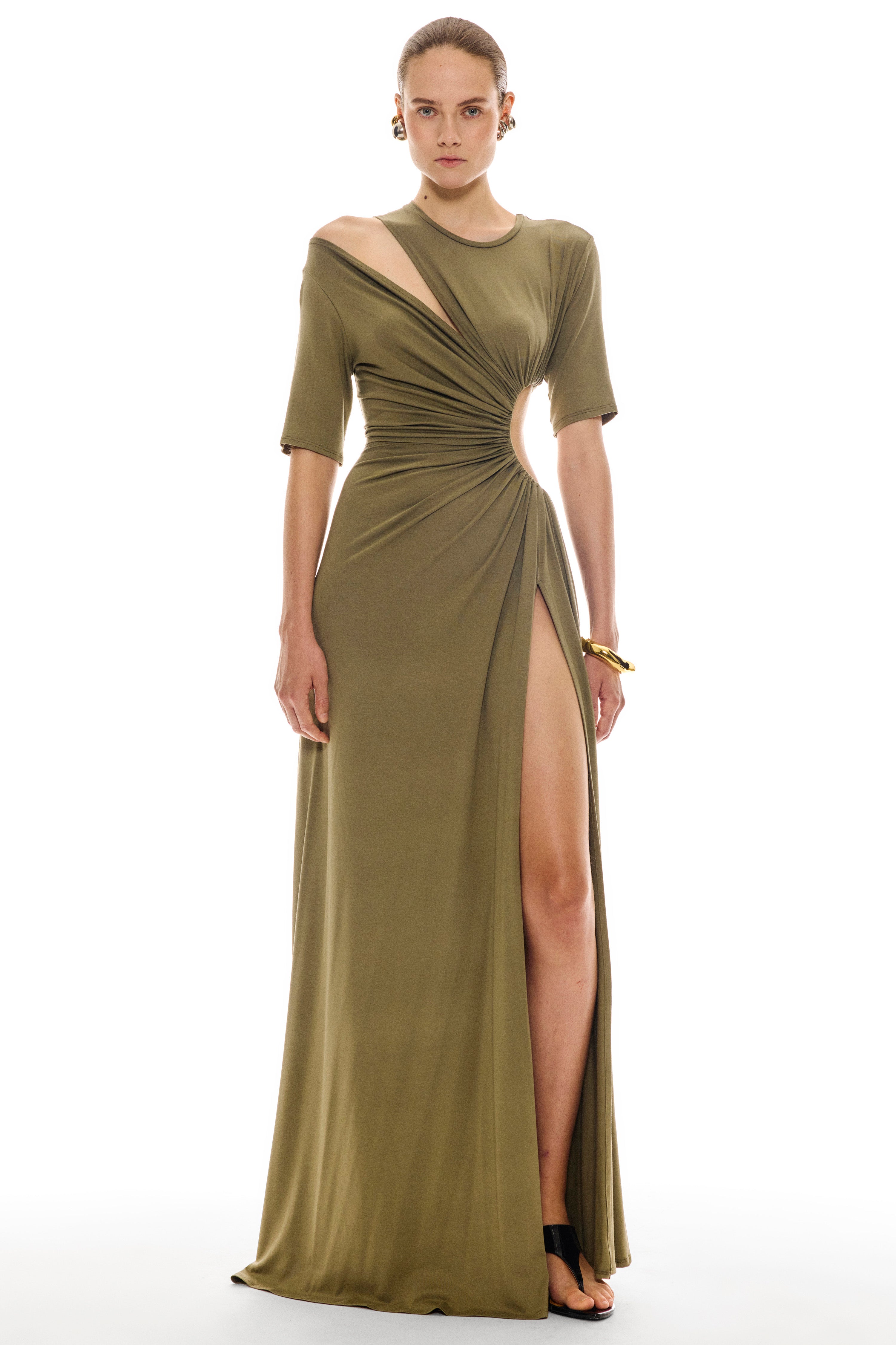 - The shoulder has a hook and eye that can undo to pull one side off-shoulder. (Shown in black)
