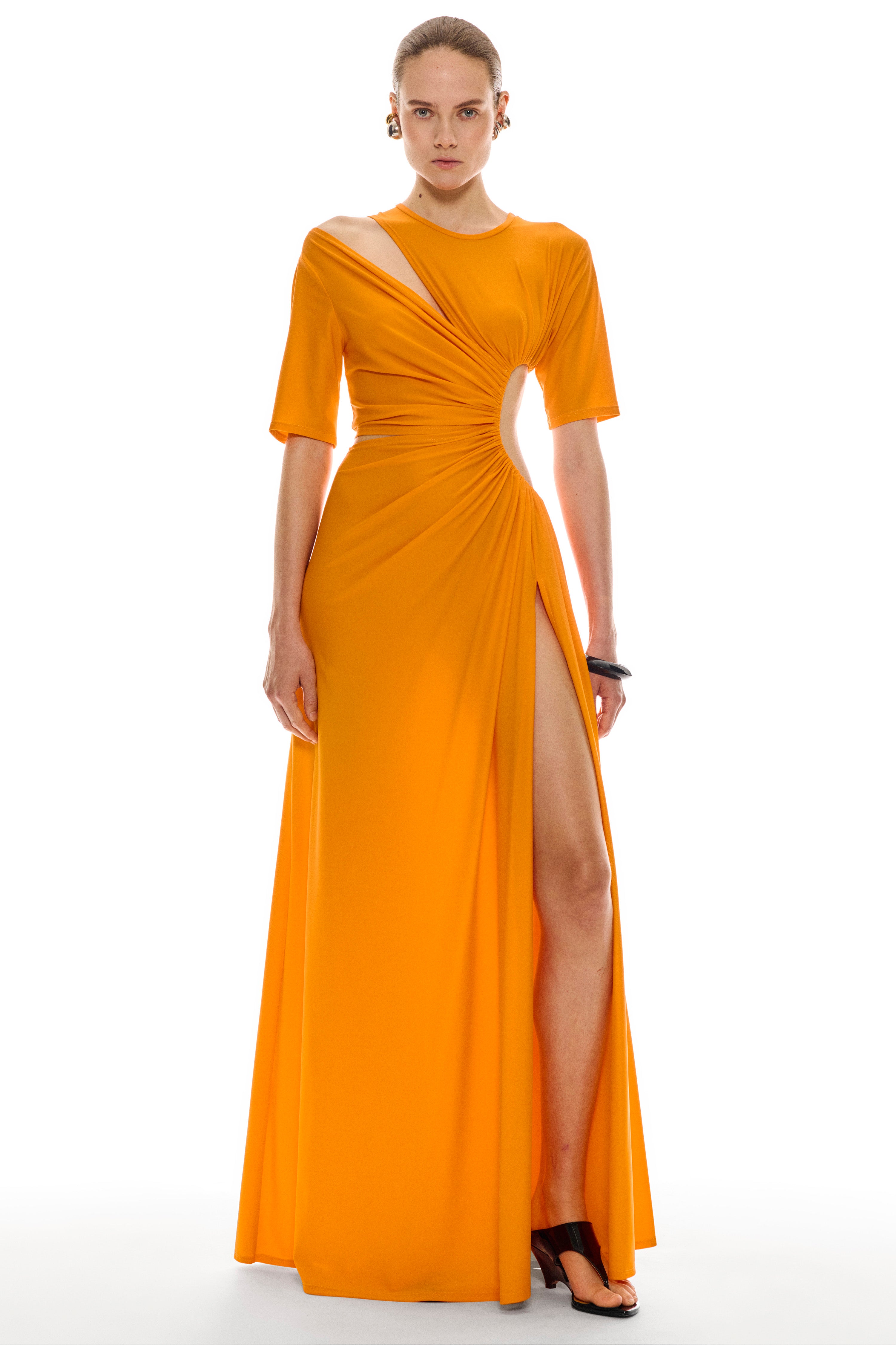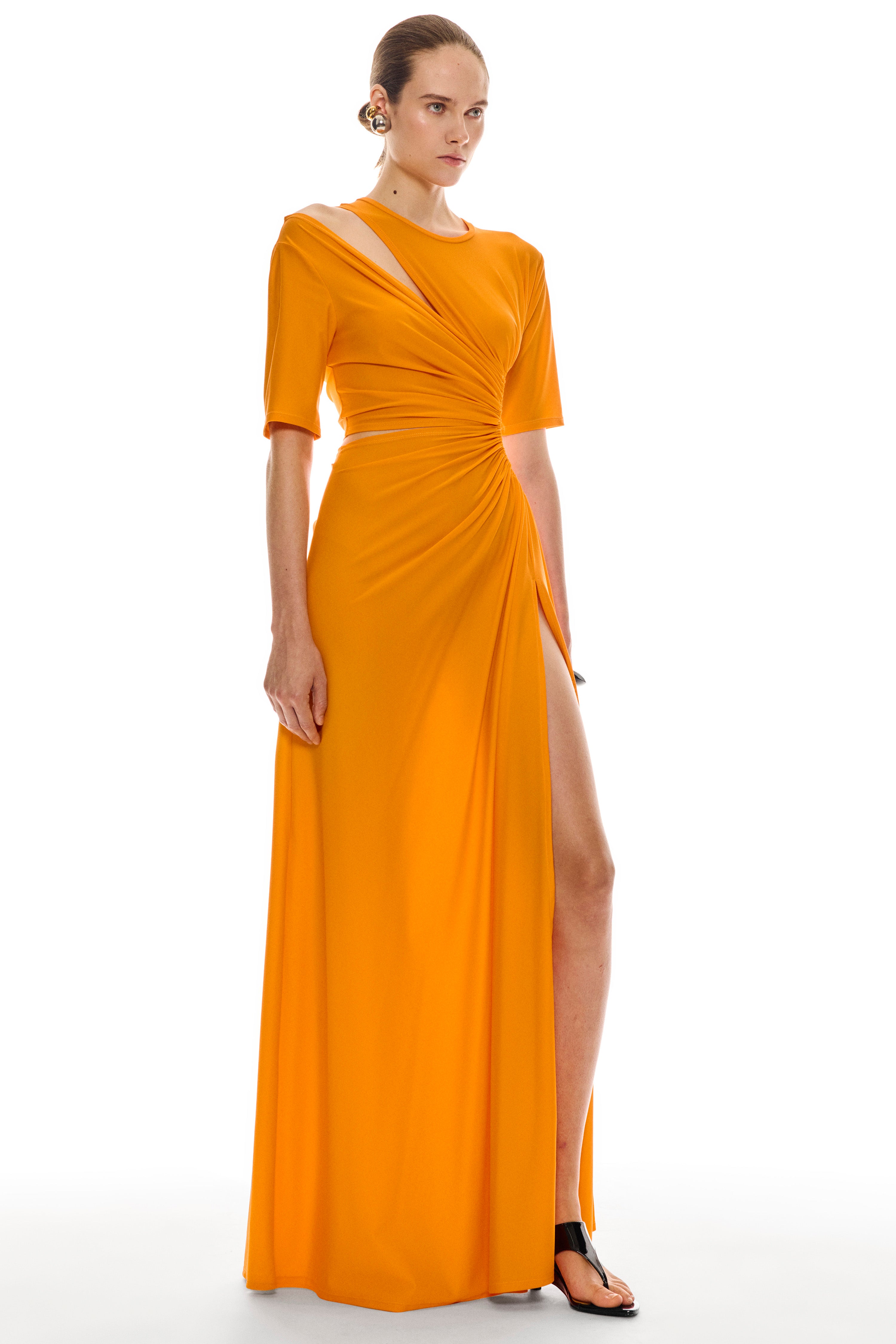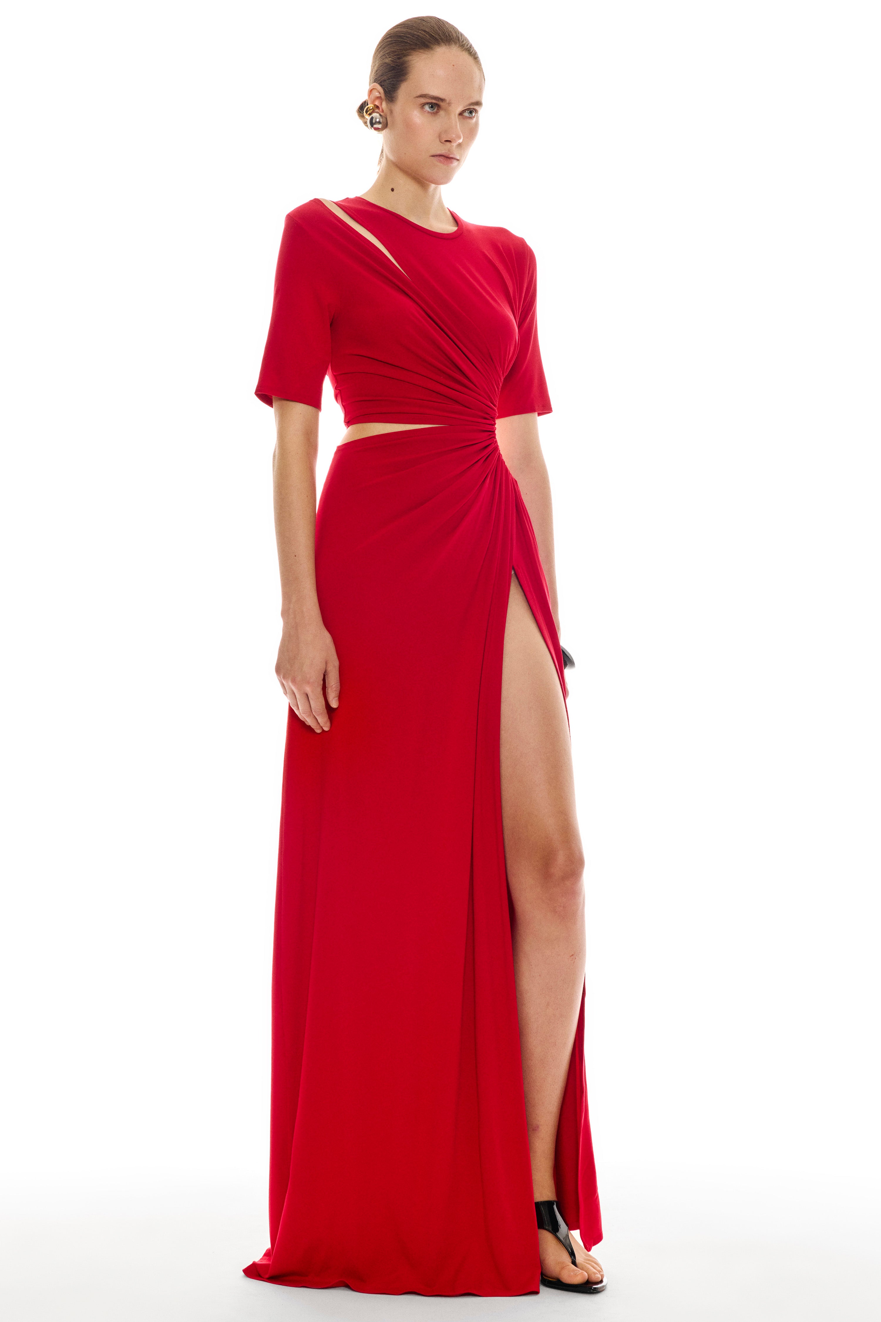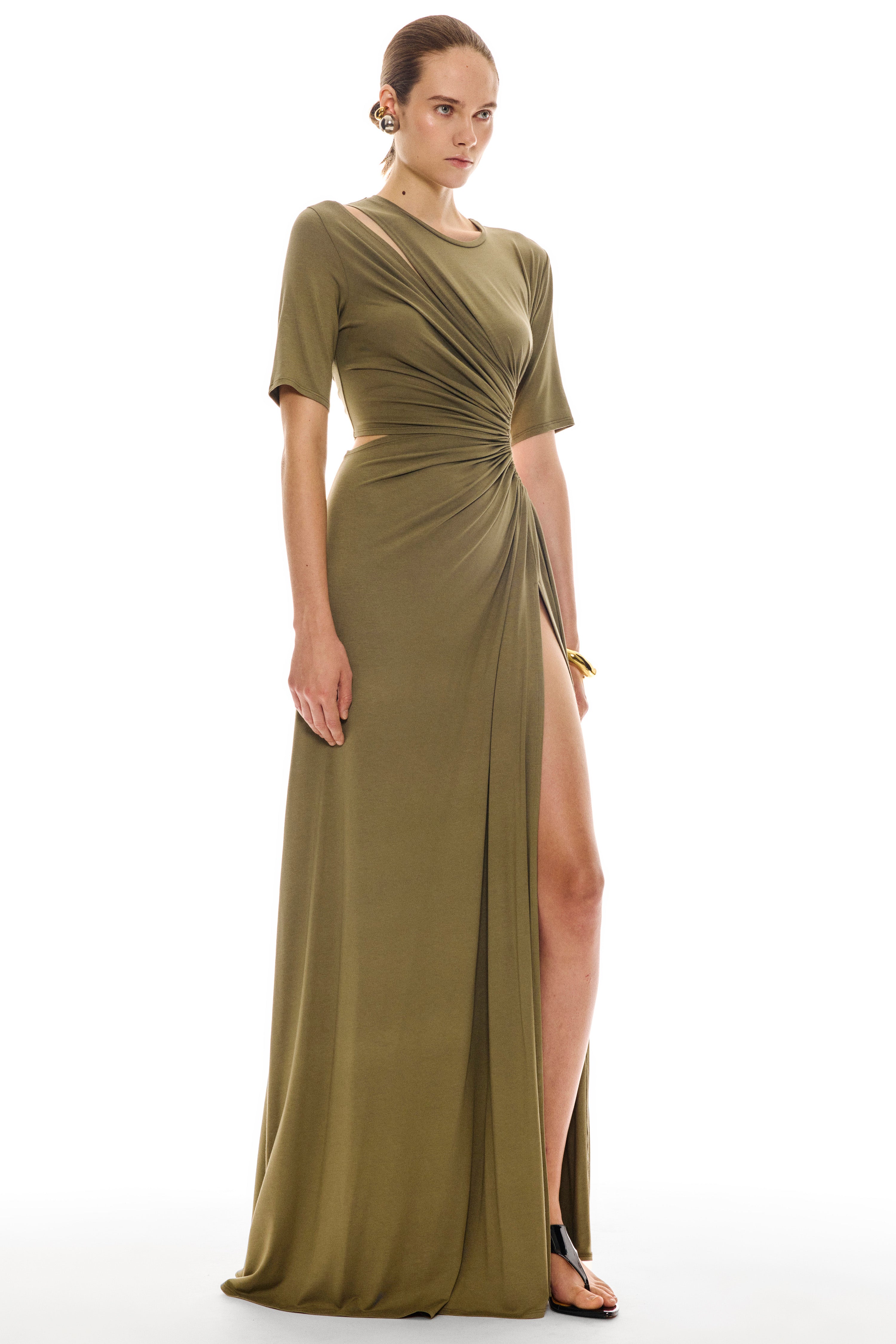 - The shoulder has a hook and eye that can undo to pull one side off-shoulder. (Shown in black)