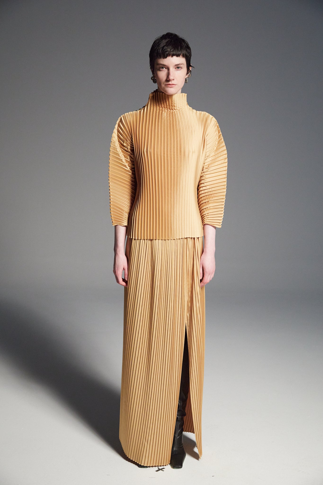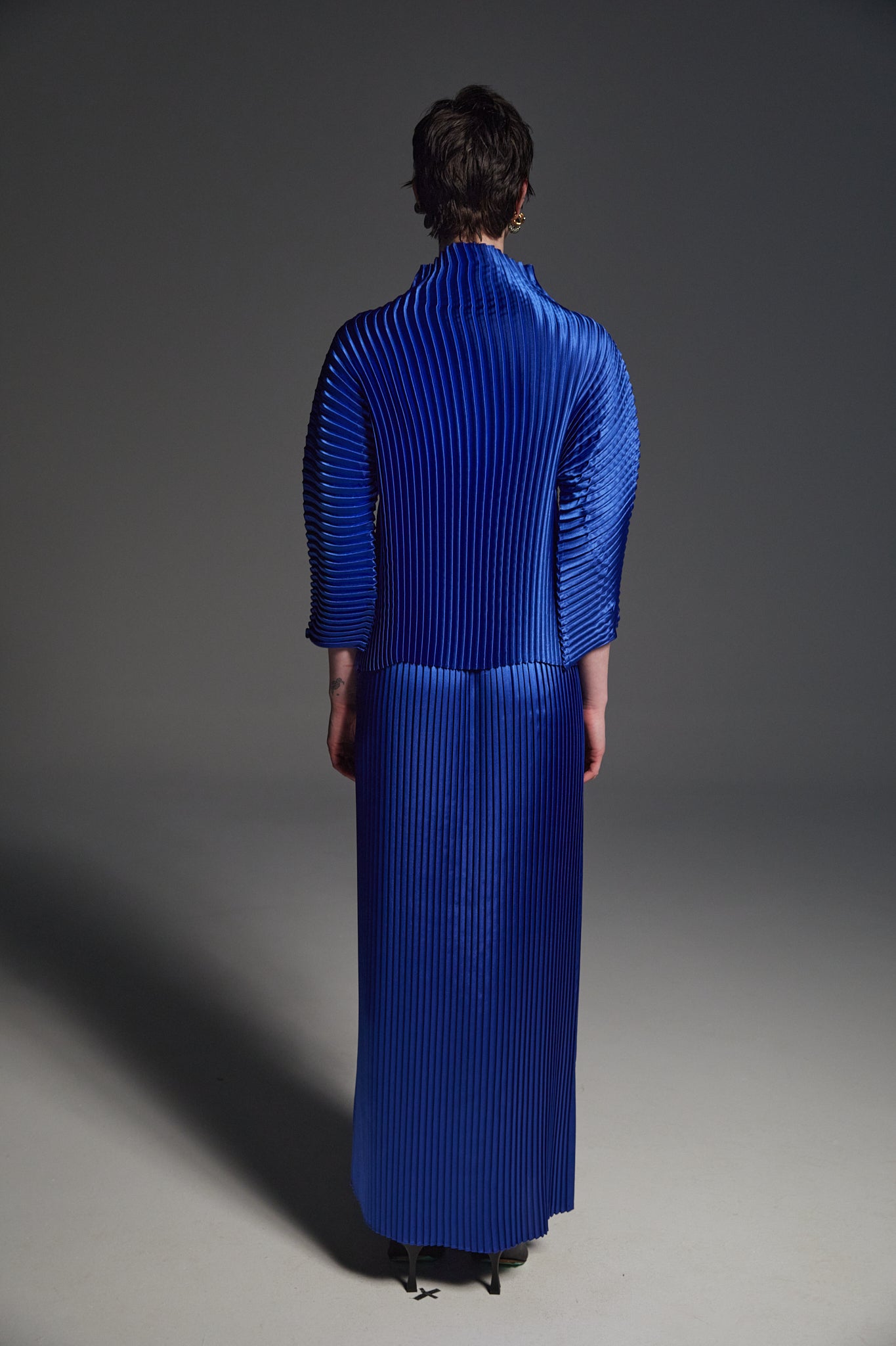 This piece is cut and sewn in Toronto, Canada, we then pleat the garment as a finished piece!