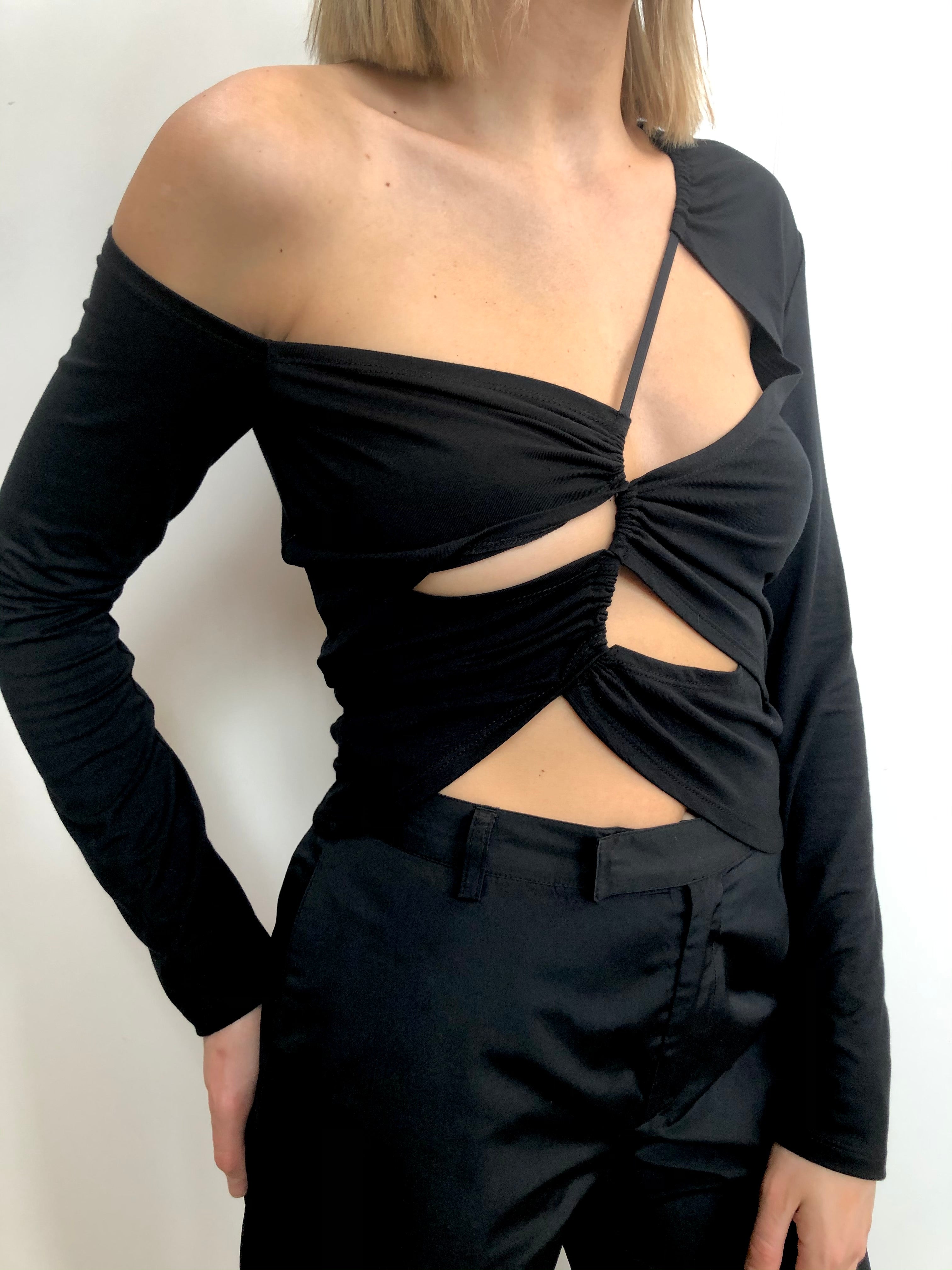 Lightweight stretch Bamboo Jersey cutout blouse.
