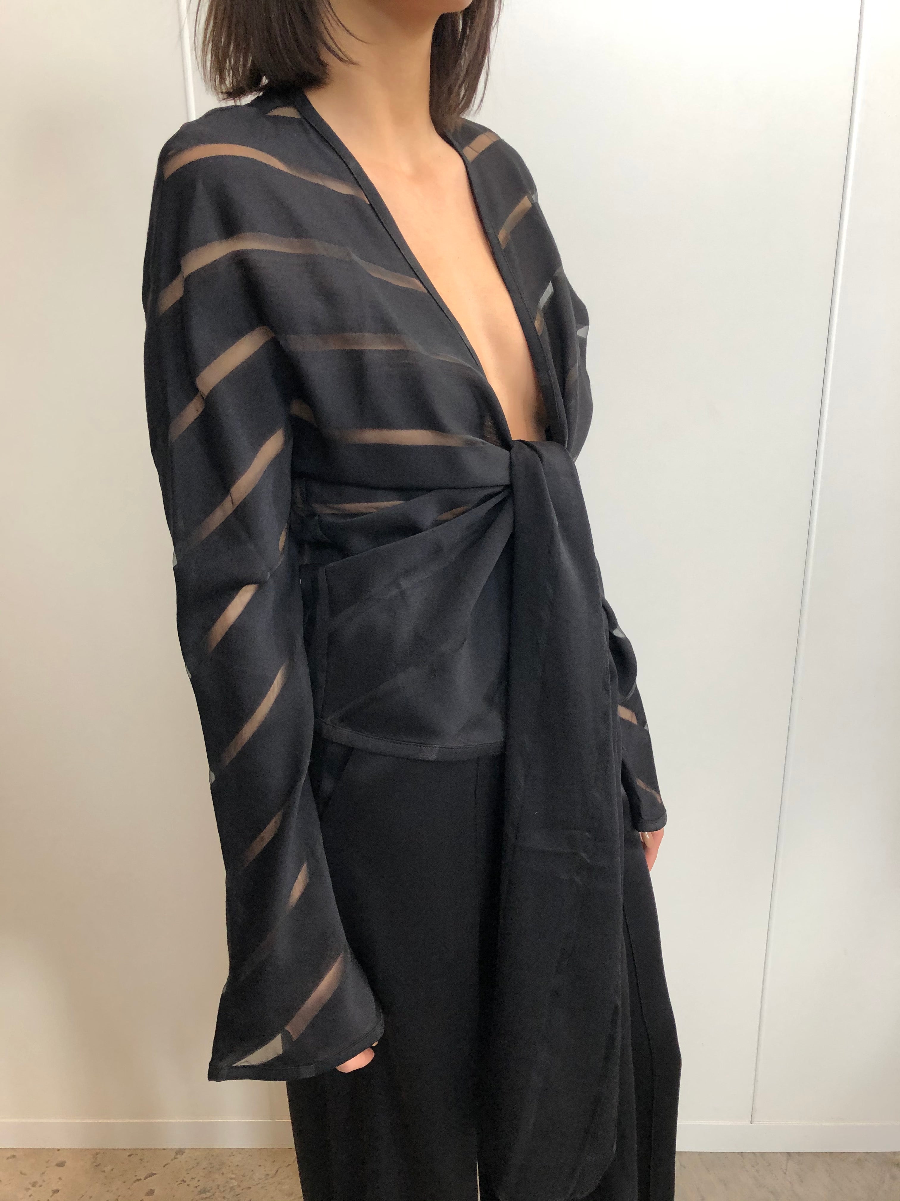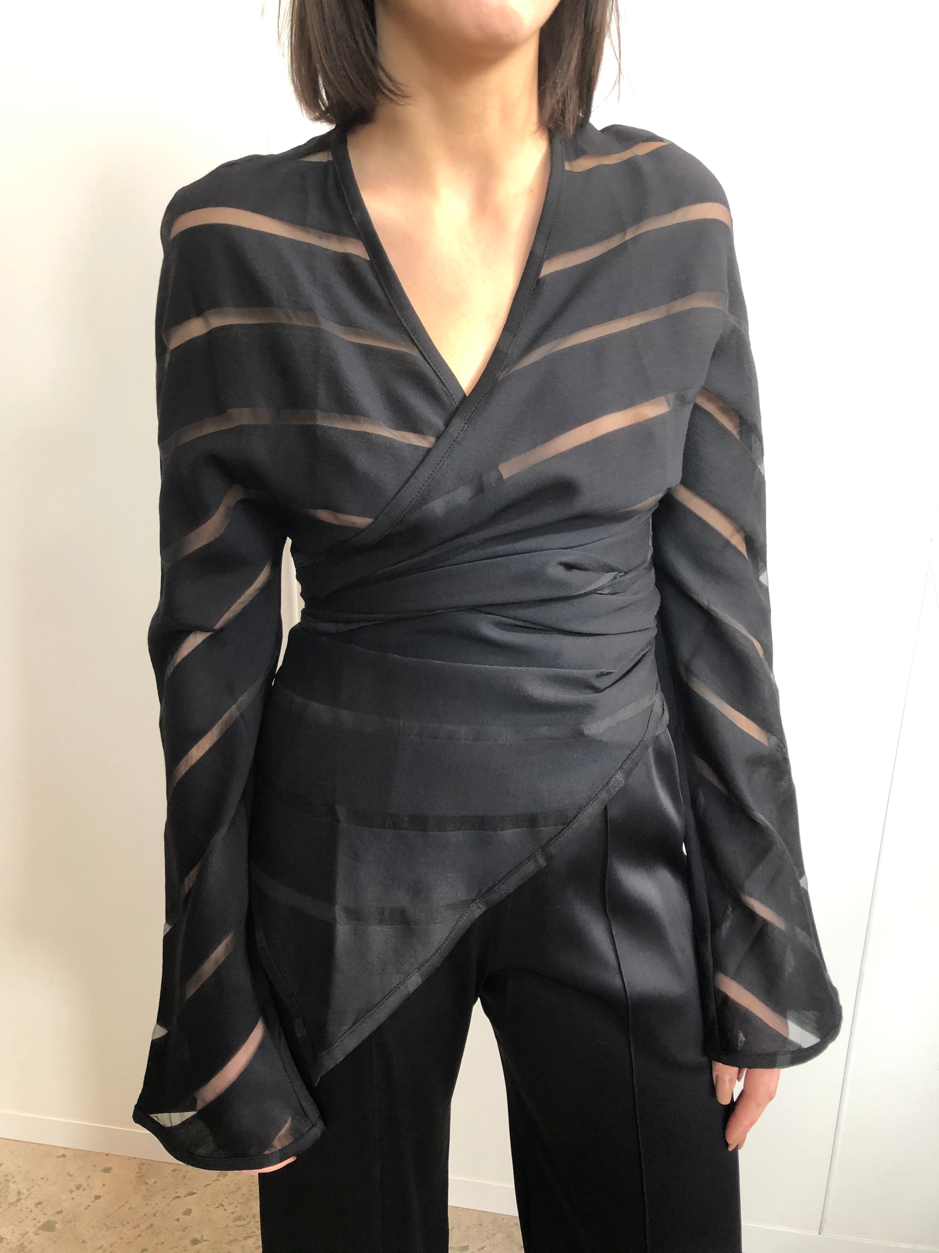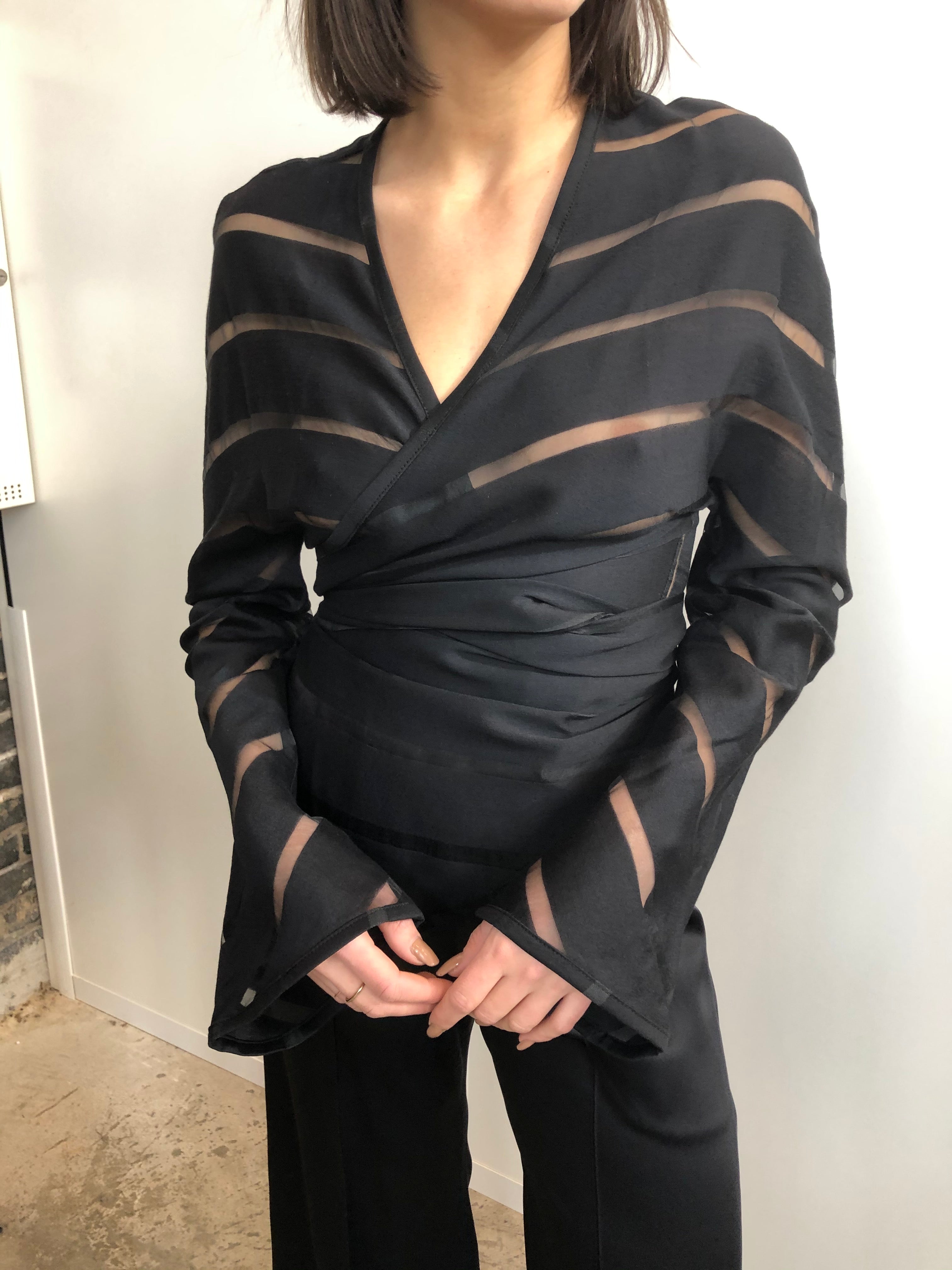 SID NEIGUM SIGNATURE SHEER STRIPE WRAP BLOUSE