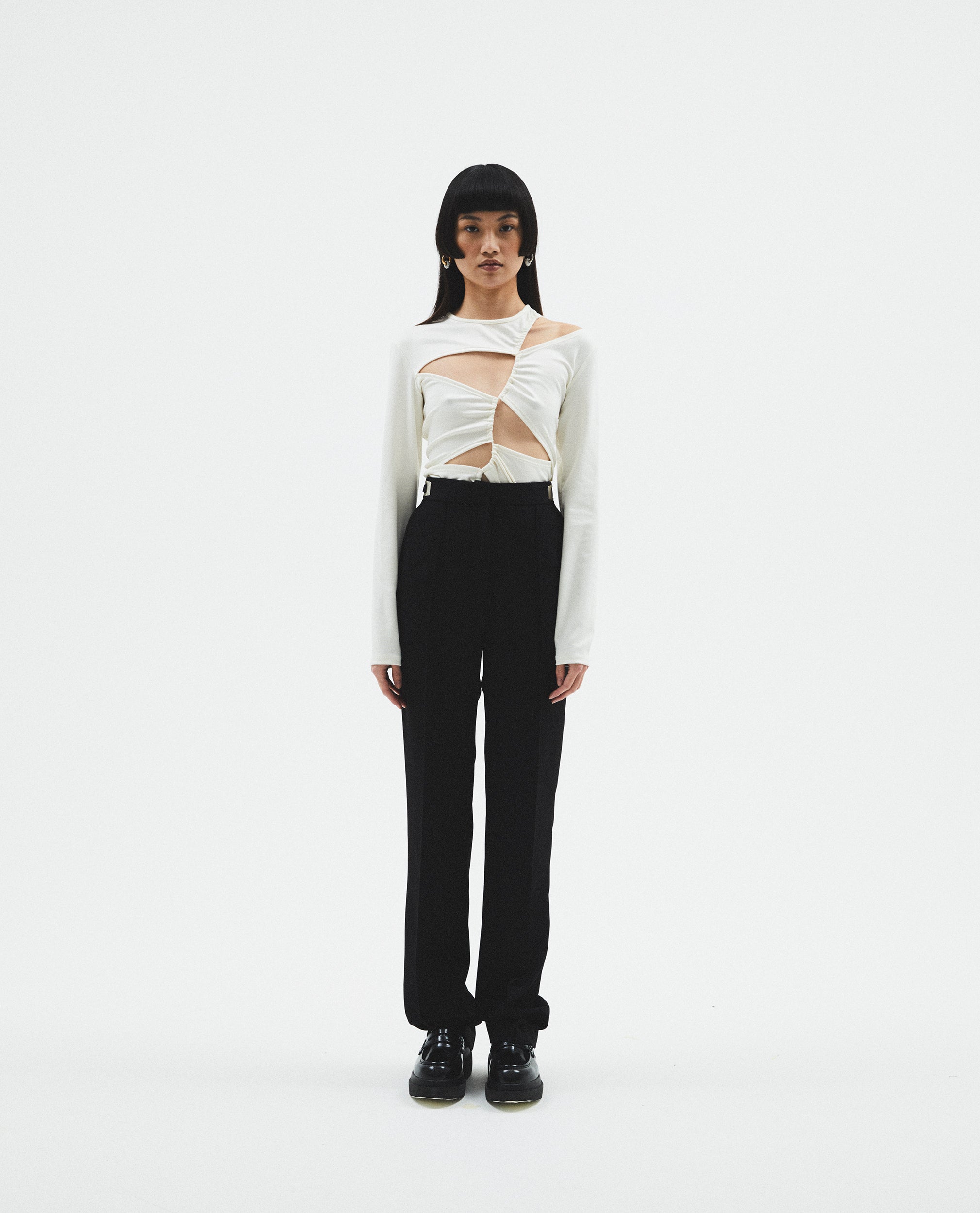 The early concept for this piece was based on a suspension bridge. A main suspension cable with multiple suspender cables spanning from the main. We drafted with the idea to have brass rod as the dividing line coming across the body. Each panel of the stretch knit was drafted to create tension on the vertical line. Early prototypes showed that the brass was too heavy, and corsetry boning was too structured. In its final form the vertical line is a stretch grosgrain ribbon which allows it to conform to the body and gives it versatility by being able to adjust the amount of gathers on the panels and position to support the bust.